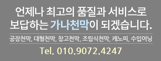 공장천막, 창고천막 전문업체천막에 대한 모든 것! 가나천막구조물첨가, 자바라천막, 차고 천막, 공사장 천막, 어닝, 케노피등 각종 천막에 필요한 제작과 판매를 성실한 자세로 책임을 다해 시공 판매하는 천막 전문기업 입니다.Read More 공장천막 대형천막 창고천막 조립식천막 캐노피 수입어닝 시공갤러리 가나천막 가나천막 가나천막 가나천막 가나천막 가나천막 가나천막 가나천막 공지사항새롭고 중요한 소식을 알려드립니다더 보기 오시는 길실시간 지도로 오시는 길을 안내해 드립니다더 보기 온라인 문의편의를 위해 온라인으로 문의가 가능합니다.더 보기 Customer Center상담문의궁금한 사항이 있으시면 언제든 문의 주세요. TEL 031-949-0429TEL 031-914-4489H/P 010-9072-4247